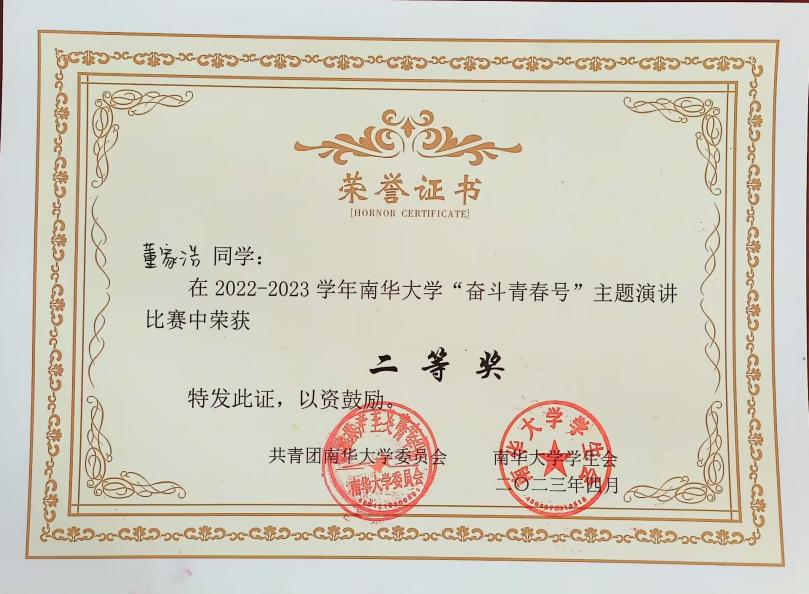 为深入学习贯彻习近平新时代中国特色社会主义思想,全面贯彻落实党的二十大精神,2023年4月,共青团南华大学委员会和南华大学学生会联合举办“奋斗青春号”演讲比赛。决赛中,beat365官方网站参赛选手董家浩同学表现优异,从比赛中脱颖而出,最终荣获二等奖。在此向董家浩同学表示热烈的祝贺!