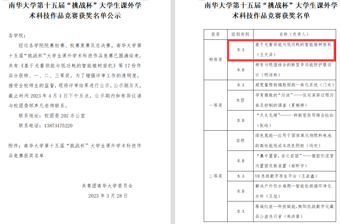 为深入学习贯彻党的二十大精神,实施科教兴国战略、人才强国战略、创新驱动发展战略,进一步引导广大学生努力培养科学精神和科学态度,积极学习科学知识和科学方法,近日,我校举办了第十五届"挑战杯"大学生科技作品竞赛总决赛,beat365官方网站王天泽团队的《基于光蓄供能与低功耗的智能植树苗机》项目荣获校级特等奖。该项目组秉承着“节能、环保”的设计理念,以提高植树效率,减少能源消耗为目的,设计了一款集自动探测土质、挖坑、植树、培土、浇水等多种功能于一体的全自动植树苗机。在此向该团队表示热烈的祝贺!
